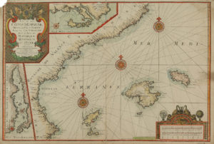 papel: 50 x 72 cm. Incluye dos vistas de pájaro: PLAN DU PORT MAON EN L´ISLE DE MINORQUE; PLAN DE LA BAYE DU SOFA. Bellamente iluminado. Carta náutica que forma parte del Atlas Mediterráneo de Muchelot y Bremond que menciona Palau: 168324. Plegado, algo sucio y mínima falta de papel en la esquina superior derecha; remarginado al dorso.