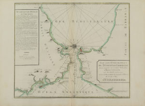 1750 ca. MAPA: (CARTA NÁUTICA-GIBRALTAR). LYNSLAGER, HENRI; VEZOU: PLAN TOPO-HYDROGRAPHIQUE DU DÉTROIT DE GIBRALTAR... Paris. Mapa calcográfico sobre papel verjurado. Huella: 52 x 70 cm; papel: 46,5 x 54 cm. Límites finamente iluminados a mano de...