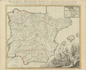1750. MAPA: (ESPAÑA-BENEDICTINOS). HISPANIA BENEDICTINA, SEU MONASTERIA ET ALIA PIA LOCA ORD. S. BENEDICTI, QUAE IN REGNIS HISPANIAE PORTUFALLIAE NEC NON AMERICA IN HODIERNUM USQUE DIEM FLORENT IN LUCEM... Norimbergae: Homannianorum Heredum, publica...