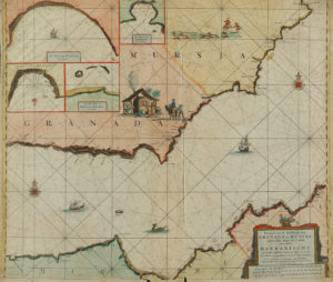 papel: 53 x 60,5 cm. Iluminado a mano. En la esquina superior derecha detalles de la bahía de Almería, Cartagena, Buzema y Zafarinos. Corto de margen superior, remarginaciones al dorso, pequeñas rasgaduras y arrugas en el margen inferior; plegado. Esta carta náutica apareció en la última edición De Nieuwe Groote Lichtende Zee-Fackel de Van Keulen.
