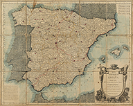 1802. MAPA: (ESPAÑA). LOPEZ, TOMÁS: MAPA GENERAL DE ESPAÑA, DEDICADO AL SERENISSIMO SEÑOR DON FERNANDO PRINCIPE DE ASTURIAS. Madrid, 1802. 49 x 59 cm. Entelado, coloreado y plegado. Deteriorado y con restos de cinta adhesiva.
