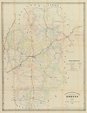 1862. MAPA: (CORREOS-POSTAS). CARTA DE CORREOS Y POSTAS DE LA PROVINCIA DE BURGOS. (Madrid): Lit. de Castell, 1862. 12º. Mapa y estado plegado con las poblaciones con correo dirario, ambos muy limpios. El mapa con los límites acuarelados. Rústica...