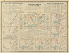 1866. MAPA: (CORREO-POSTAS). CUADRO SINÓPTICO DE LOS TRABAJOS EJECUTADOS DESDE 1857 Á 1865 PARA EL ESTABLECIMIENTO DE CORREO DIARIO en las poblaciones de ayuntamiento publicado por la direccion general de correos. (Madrid): Lit. de Castell, 1866....