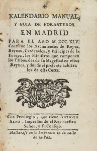 1745. LIBRO: (VIAJES). KALENDARIO MANUAL , Y GUIA DE FORASTEROS EN MADRID PARA EL AÑO M DCC XLV. [Madrid]: Imp. Antonio Sanz, [1744]. 12º. 107 p. Enc. en pergamino de época, con las correas. Una de las más tempranas guías de forasteros de...