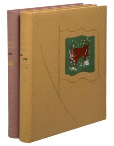 Trois volumes grand in-4° (dans un étui): • plein maroquin, le premier tome colchique tendre, le second chair de pêche, sur le premier plat drapeau vert mosaiqué portant un taureau rouge sang seché, dos lisse titré à l’or, chasses rembordées, contreplat et garde de papier à la cuve, triple feuillet d’habillage, couverture et dos conservés, têtes rases, autres tranches non rognées. • Suite: emboitage demi maroquin âne, plat de papier à la cuve, lacets. Reliure de l’abbaye de Maumont. La reliure reprend le graphisme de la couverture de l’éditeur et du frontispice du premier volume, en l’insérant dynamiquement dans un drapeau flottant au vent. Tiré à 160 (140 + XX) exemplaires, celui ci numéro XIII, sur japon. La suite pour Kim (numéro 90/160) est malheureusement déficiente de la 15ème planche. Très bons exemplaires dans des maroquins aux teintes délicates. Référence : Danuta, I, L19.