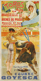 1915 ca. CARTEL: COLMENERO: TOROS EN MARSEILLE. 77 x 110 cm (30,5 x 43 in). Compuesto de 3 hojas no montadas. Diversos cortes y erosiones. B-.