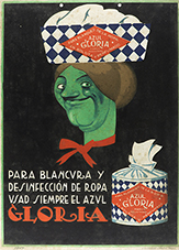 11 in). Tres finísimos taladros. Dos perforaciones en el margen superior para colgar. [Más] Id. PARA BLANCURA Y DESINFECCIÓN DE ROPA USAD SIEMPRE EL AZUL GLORIA. Id. Litografía sobrepuesta en cartoné. 34 x 24 cm (13,5 x 9,5 in). Finísimo taladro. Perforaciones en el margen superior para colgar. Algo sucio. Tres displays publicitarios. A.
