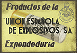 1935 ca. CARTEL: (PUBLICIDAD). DOMINGUEZ: PRODUCTOS DE LA UNIÓN ESPAÑOLA DE EXPLOSIVOS S.A. EXPENDEDURÍA. Litografía. 35 x 50 cm (14 x 19,5 in). Sucio. Pequeñas abrasiones marginales. A-.
