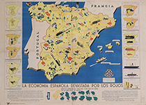 1940 ca. CARTEL: LA ECONOMIA ESPAÑOLA DEVASTADA POR LOS ROJOS. Ediciones de vicesecretaria de Educación Popular. 70 x 99 cm (27,5 x 39 in). Mapa litográfico con leyenda alrededor. Alguna rasgadura restaurada. Plegado. A.
