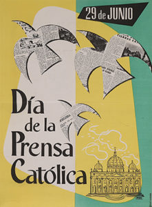 (64 x 44 cm, 25 x 17,5 in); 29 DE JUNIO, DÍA DE LA PRENSA CATÓLICA (68 x 50 cm, 27 x 19,5 in); ELLOS NO VOTAN... TÚ SÍ (22 x 31,5 cm, 8,5 x 12 in); SANTAMARIA: 25 AÑOS DE PAZ (22 x 31,5 cm, 8,5 x 12 in). Los cuatro primeros plegados. A.