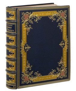 Un volume in-4°, plein maroquin bleu nuit très richement doré et mosaiqué, chasses largement rembordées et dorées, réserve du contreplat et garde de tissé moiré lie de Chambertin, seconde garde de papier marbré, triple feuillet d’habillage, couverture et dos conservés, toutes tranches non rognées dorées. Sous sa chemise et dans son étui assortis. Reliure et dorure de Maylander. Exemplaire en parfait état, comme neuf, dans une reliure de pure virtuosité. 176 compositions d’Auguste Leroux. Tiré à 410 exemplaires, celui ci numéro 282. Médaillon ex libris de maroquin portant le monogramme enlacé L D et la devise Dousse est l’amitié (L. Dousse). reproduction ci-contre