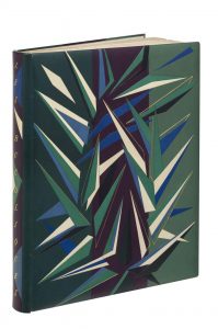 Un volume in folio, box tiercé en pal (figuier, cassis & olivier), vaste mosaique buissonant sur les plats, dos lisse mosaiqué et titré à l’or, contreplat et garde de velours vert sombre, triple feuillet d’habillage, couvertures et dos conservés, toutes tranches dorées. Sous sa chemise de demi maroquin noir et plat de papier balsa et dans son étui de même. Reliure signée Creuzevault. Lithographies en couleurs de Jacques Villon. Edition originale, imprimée à plus de 270 (245 + 24 + quelques uns) exemplaires, celui ci numéro 136. Exemplaire enrichi de deux aquarelles originales, la seconde signée, de Jacques Villon, lesquelles ont été lithographiées pages 96 & 97. Très bel exemplaire dans une étonnante reliure.