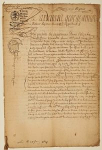 EURE-ET-LOIR. 1674. Pardevant George AMIOT Notaire Royal à CHAMPROND-EN-GÂTINE, Testament et codicille de Dame Elisabeth BAUGER femme d’Honorable homme M. Gérard CHOUET Conseiller et Secrétaire de feu la Reyne mère, Bailli et Maître particulier des Eaux et forêts de la Baronnie de CHAMPROND, demeurant à Champrond, du 11 Février 1674. (Cachet du Cabinet d’Hozier) 3pp in-folio.