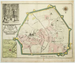 SAINT DENIS (93). Gravure fin XVIIe représentant la ville de ST DENIS, sa Basilique et ses remparts. « Topographia Regii ac Inclyti Monasterii S. DIONYSII in quo,… » (35 x 42cm) Etat B+. Coloris anciens.