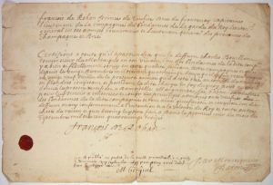 François de ROHAN, Prince de SOUBISE (1630-1712) Duc de Frontenay, Capitaine Lieutenant de la Compagnie des GENDARMES de la Garde du Roy, lieutenant général en ses armées, Gouverneur et Lieutenant Général des Provinces de CHAMPAGNE et de BRIE - Pièce signée à son en-tête manuscrite. Il certifie que le défunt Charles BOUILLANT, Ecuyer sieur de Montaigus, en son vivant l’un des Gendarmes de ladite Compagnie, y a bien et fidèlement servi pendant cette Campagne et que le 29 juillet 1693, il a été tué au combat de NERVINDE en Flandres. Nous avons donné le présent certificat à damoiselle Marguerite DE BAZON, sa veuve… » - Fait à Paris le 1er Septembre 1693 – 1 page (24 x 36) - Sceau de cire aux armes.