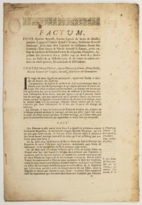 MARNE. 1693. PAPETERIE de REIMS (51). « FACTUM pour Apoline BENOIST, femme séparée de biens de Maître Jacques LEPAGNOL Notaire Royal à REIMS… Contre Henry OUDINET, Marie HERVIER sa femme…. » Procès d’héritages concernant un remariage. « Fait Isac HERVIER a été marié deux fois. Le 14 juin 1634, les Échevins de REIMS firent un Bail à HERVIER des Fouleries de cette ville pour neuf années, moyennant 445 livres de redevance. Ils le chargèrent de faire quelques réparations. Le 28 May 1638, les Échevins de REIMS firent un Traité avec lui, par lequel il s’obligea de construire une Papeterie, à condition qu’il en jouirait 28 années sans aucune redevance que de deux rames de papier de 6 livres par chacun an… » Imprimé de 1693. Cachet du Cabinet d’Hozier. Imprimé 13 pages (35 x 24 cm)