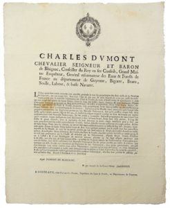 GUYENNE, BIGORRE (65), BÉARN (64). 1694. EAUX FORÊTS - Charles DUMONT Seigneur et Baron de BLAIGNAC, Conseiller du Roy, Grand Maître Enquêteur, Général réformateur des Eaux Forêts de France au département de GUYENNE, BIGORRE, BÉARN, SOULLE, LABOUR, BASSE NAVARRE.” - BORDEAUX (33) 21 Juin 1694 - Amnistie générale du Roy à tous les propriétaires des Bois taillis de la Province de GUYENNE, qui ont coupé ledit bois sous l’âge de 10 ans, dans lesquels ils n’ont pas laissé les Baliveaux portés par la nouvelle Ordonnance des eaux Forêts du mois d’août 1669 - Vignette Royale. Placard (41 x 33) État A