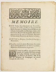 OISE. COMPIÈGNE (60). « Mémoire (de procès) pour Messire Jean-Baptiste De FRANSURE, Capitaine de Vaisseau du Roi au Département de Brest, et sa femme ; Contre les Religieux Jacobins de COMPIÈGNE. Du 15 Juillet 1694. Impr. A Paris chez P.G. Simon, Imprimeur du Parlement, rue Mignon, 1776 ; 32 pages in-4°. « Fait. En l’année 1738, le feu Roi donna au père du Sieur de Fransure, un terrain situé à Compiègne. Le terrain faisait partie des remparts de Compiègne. Quelque temps après le Sieur Fransure de Villiers prit à cens des Prieur Religieux de L’Abbaye de St Corneille de Compiègne, une autre partie de terrain… »
