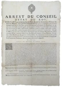 DAUPHINÉ SAVOIE. 1704. POIDS MESURES - “Arrest du Conseil d’Etat du Roy, portant que les redevables du Droit Annuel des Contrôleurs-Visiteurs des Poids et Mesures, créez par Édit. du mois de janvier 1704 le payeront à la première demande qui leur en sera faite, en leur délivrant par les préposés des Certificats sur papier non timbré des sommes qu’ils auront payées...: Et que les Maîtres des Coches, Carrosses Messageries qui ont plusieurs Bureaux tant à Paris qu’autres Villes, payeront ledit Droit annuel pour chacun de leurs Bureaux... - du 15 avril 1704 - suivi d’extrait des Registres du Conseil d’Etat signé DU JARDIN - Arrest exécuté par BOUCHU, Intendant en DAUPHINÉ SAVOYE des Armées de Sa Majesté en Italie, fait au Camp de la Pérouse ce 15 Juillet 1704 ) - Vignette et Lettrine. Placard (51 x 36) État B