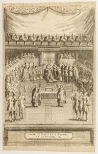 « SACRE DE LOUIS XV À REIMS » (51) le 25 Octobre 1723. Gravure à l’eau-forte, vers 1725. (31 x 19,5 cm)