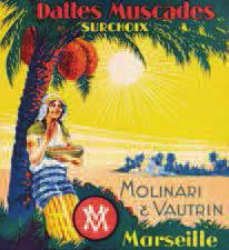Publicité cou-leurs Molinari et Vautrin pour les dattes Muscades. Marseille. Dim. 42x40cm. Encadré.