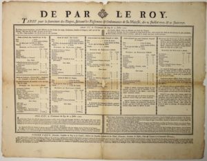 ARMÉE DE LOUIS XV. 1746. TARIF DES RATIONS DE BOUCHE. Généralité d’ORLÉANS. « TARIF pour la fourniture des Étapes, suivant les Règlements Ordonnance de Sa Majesté, des 13 Juillet 1727 30 Juin 1737. Ordonnance de Pierre PAJOT Intendant en la Généralité d’Orléans, du 20 Août 1746. Ration de bouche : Le Pain, le Vin, le Cidre, la Bière, La Viande, le Fourrage… Nombre de rations à fournir par grade pour un Garde-du-Corps du Roi, un Gendarme, Chevau-Légers, Mousquetaire, Grenadier à cheval, Cavalier, Dragon, Garde Française et Suisse, Infanterie Française et Étrangère. Placard (45 x 58) Etat B. qqs manques.