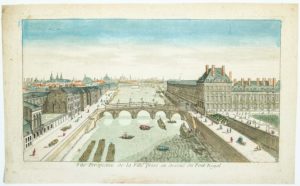 Vue d’Optique XVIIIe S. du LOUVRE « Vue perspective de la Ville de Paris pris au dessous du Pont Royal » vue d’optique inversée (23,5 x 44 cm) Coloris anciens.