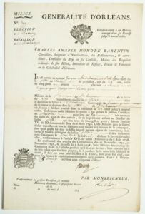 LOIRET. 1752. BATAILLON DE MONTARGIS (45). MILICE. Pièce signée BARENTIN Seigneur d’Hardivilliers, Intendant dans la Généralité d’ORLÉANS. Congé absolu au nommé Jacques Madeleneau dit Bellecoeur, Milicien de la Paroisse de Saint Sauveur de la levée de 1750, lequel sert en qualité de soldat. Fait à Orléans (45) le 25 May 1752. 2 Vignettes Royale et aux armes.
