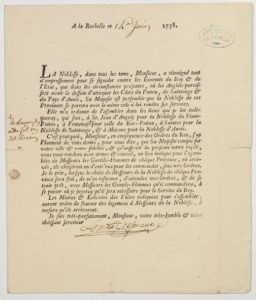 Jean Charles de La Ferté, Marquis de SENNETERRE ou Saint-Nectaire, Maréchal de France en 1757 - Lettre impr. avec Signature Autographe “le Maal de SENECTERE”, à la ROCHELLE (17) ce 14 juin 1758 – à M. De VILLIERS à Villiers - Petit cachet de collection – Il lui demande en tant que Noble de se rendre avec armes et cheval pour se signaler contre les ennemis du Roy de l’État. « Dans les circonstances présentes, où les Anglais paraissent avoir le dessein d’attaquer les Côtes du Poitou, de Saintonge du Pays d’Aunis… »