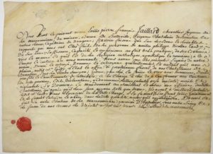 VENDÉE. Pièce signée du Puissant Louis Pierre François JAILLARD Chevalier, Seigneur de la MARRONIÈRE, du Moiron, Baron de Belleville, Seigneur et Châtelain de Beaulieu, Capitaine de Dragons. Fait au Château de LA MARRONIÈRE à AIZENAY (85) le 10 Juillet 1763. Il donne au Sieur TARDY l’État et l’Office de Procureur Fiscal de ses Châtellenies de BEAULIEU sous LA ROCHE SUR YON (85). Vélin (25 x 34,5).