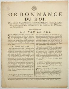 GIRONDE. 1768. « Ordonnance du ROI (LOUIS XV), qui accorde des Gratifications à tous les bas Officiers, Soldats, Cavaliers Dragons, ainsi qu’à toutes personnes qui arrêteront des Déserteurs ou Embaucheurs. » LOUIS XV et le Duc de CHOISEUL - Fait à VERSAILLES le 17 Décembre 1768 – De l’imprimerie de Simon DE LA COURT fils, seul Imprimeur du Roi, rue du Cahernan, à BORDEAUX (33). Placard (42 x 33) État A