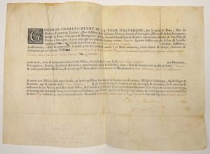 GIRONDE) CASTELMORON D’ALBRET - LA TOUR D’AUVERGNE (Godefroy-Charles-Henry) Duc de BOUILLON, Vicomte de TURENNE, duc d’Albret et de Château-Thierry, Comte d’Auvergne, d’Évreux... Pair et grand chambellan de France, Gouverneur de la Province d’AUVERGNE (En-tête imp.) : Pièce signée “Le Duc de BOUILLON” sur une Charge de l’Office d’HUISSIER AUDIANCIER en l’ordinaire de PELLEGRÜE Sénéchaussée de CASTELMORON dépendant de notre Duché d’ALBRET - Donné en notre Château de NAVARRE 10 Sept 1773 - Vélin (36 x 25) en partie impr.