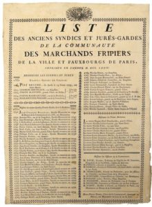PARIS. 1774. COMMUNAUTÉ DES MARCHANDS FRIPIERS - “Liste des Anciens Syndics et Jurés-Gardes de la Communauté des MARCHANDS FRIPIERS de la Ville et Faubourgs de PARIS, imprimé en l’année 1774.” - Liste de noms adresses, avec l’année de Jurande et l’année de Syndicat - Vignette et frise. Placard (36 x 50) État A