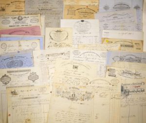 LYON (69) – COLLECTION DE 120 FACTURES de 1775 à 1912, toutes différentes, majorité XIXe S., à voir, quelques belles illustrations, qqs défauts : GARIN rue Neuve à Lyon, Chandelle à façon de bougie 1775 + CARRIER, Bossetier-Doreur et Argenteur sur Métaux, Grand ‘Rue Mercière, N°44, à Lyon 1818 + POCHAT Cie, tiennent Fleurs, modes, Soieries et articles de nouveautés, 3 Grande Rue Mercière Lyon 1818 + TURPAULT Cie, fabrique de Mouchoirs, 4 rue des trois Carreaux Lyon 1824 + DESCHAMPS Cie, Soieries, Fournitures pour Chapellerie, 15 rue Dubois Lyon 1827 + CHARRIN, Draperies et nouveautés, 11 rue trois carreaux Lyon 1831 + PATURLE Cie, tiennent Soieries, Schals, nouveautés, 1 rue St Pierre Lyon 1833 + CHAUTAGNAT DUSSIEUX Toiles, broderies, Rue St Dominique Lyon 1838 + BRÉBAND, Porcelaines, cristaux, faïences, 4 rue St Dominique Lyon 1838 + AYME fils 2 rue St Dominique Lyon 1838 + GERMANET, Fabrique de Carmin indigo, 7 rue de la gerbe Lyon 1842 + FUSIL Fumiste, fait toutes sortes de cheminées, Lyon 1846 + POUDRET magasin de Chapellerie, 1 Rue de la préfecture Lyon 1842 + PENCHINA Laines pour fabrique pur matelas, 6 rue Malesherbes Lyon 1851 + BIÉTRIX, « A LA LICORNE » droguerie, pharmacie, Rue de l’Enfant-qui-pisse Lyon 1852 + THIEVON Frère, Épicerie, Droguerie, 5 Place des Cordeliers, Lyon 1853 + Pharmacie CLAUDIUS MOTTE 42 rue ci-devant de Bourbon, actuellement rue de la République Lyon 1855 + BOUCHE Manufacture de Papiers peints, 80 rue Centrale Lyon 1855 + Ancienne Maison CHAINE, Gds Magasins de nouveautés, Place des terreaux Lyon 1856 + BAUGIER Articles de Roubaix, 10 rue Gentil à Lyon 1861 + MAGE Ainé, manufacture de tissus métalliques, 92 rue de Sèze Lyon 1861 + MONTAUT, dépôt de Tricots e laine et Bonneterie, 71 rue Impériale Lyon 1861 + Mlles LONGERES SANGOUARD Robes et confection, 1 rue de l’impératrice Lyon 186? + FILLON Ainé Rouennerie, indiennes, 12 rue Centrale Lyon 1862 + BLANC CIE, Fabrique de Bijouterie et Joaillerie, Rue St Côme Lyon 1862 + FAYETON, Fabrique d’ornements d’Église, 2 Quai Fulcheron Lyon 1867 + Fabrique de Chocolat PAYRAUD Cie, 20 rue d’Aboukir Lyon 1868 + RANDIN Confiseur, Place de la Comédie Lyon 1870 + GROBON Épicerie en gros, denrées coloniales, 2 rue de l’Hôpital Lyon 1872 + PERRAUD MALARD Fabrique de Bijouterie et Joaillerie, 15 rue Mercière Lyon 1873 + Camille ZIPPERLIN Construction de mécaniques Jacquard, 17 rue saint Vincent de Paule, Croix-Rousse, Lyon 1876 + CORNILLON Perles en gros, 9 rue de la Préfecture Lyon 1879 + COTTIN Miroitier 25 Quai de l’Hôpital Lyon 1880 + MOSONI Manufacture de ferblanterie, 1 rue Saint André Lyon 1881, etc…