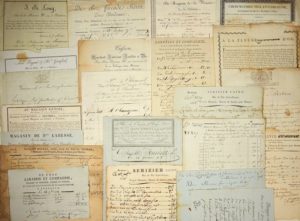 BORDEAUX (33) COLLECTION DE 24 FACTURES DE BORDEAUX de 1776 à 1826 – Presque toutes différentes, à voir, entêtes gravés. Qq. défauts : Jacques MILHAS, Ainé, Rue du Pas St. Georges, à Bordeaux, vend Draperie, dorure Soierie pour Homme. Bordeaux 1776 + SERIZIER L’AINÉ Rue du Pas Saint-Georges, Vend draperie, Dorure Soierie pour homme Bordeaux 1778 + « De Chez LARABRIE et Compagnie, Magasin de Draperie, Soierie et Dorure, au coin de rue Poitevine et du Grand Marché, à Bordeaux 1784 + « De Chez POUPARD Père et fils, au Quai de la bastide à Bordeaux 1786 » + JEAN DAVID Marchands, ci-devant au Marché-Royal à Bordeaux, vend Draperie, Dorures Soieries pour hommes et pour femmes. 1789 + BOUYER et GOUGIE, rue du Pas St Georges N°14, vendent Draperie soierie et dorure. 1791 + LANNÉLUC et Compagnie à la Chapelle Saint Jean, vendent de la draperie, dorure et Soierie, Bordeaux 1792 + « À la Fleur de LYS D’OR » (Le Lys déchiré à la révolution) à Bordeaux 1793, François NANTÉ fait des Épaulettes, Aiguillettes dragonnes, or et argent, Boutons uniformes. Bordeaux 1793 + CHERI MATHIEU Fils, et Compagnie, rue de la Liberté, ci-devant Royale, N°18, à Bordeaux, Magasin de chapeaux de toute espèce + DANCEMONT et Cie, Rue du chapeau rouge, N°15, tiennent toile, mousseline, dentelle et bazin, toile et bordure de Jouy et autres indiennes. An 8 + De chez MOURLANE Jeune Miroitier, rue du Puits-de-Bagne-cap N°3 + « DESFOURNIEL Cie » Bordeaux An 8 + « De Chez FORCADE Frères de Bordeaux, fossés des Salinières, N°55, vis-à-vis la maison seule, vendent Mercerie, Toilerie, etc… An 9 + « CHAMPEREUX et Cie » Bordeaux 1809 + Ant. TRIGAND H. GANSFORD, Place du Palais, N°1, à Bordeaux 1826 + Magasin en gros de Toileries et draperies, L. BIRÉ Père, de Bordeaux 1815 + Magasin de P. LABESSE Rue des Lauriers, N°3, Denrées Coloniales, Épiceries, Bordeaux 1818 + « AU MAGASIN GENOIS » Rue Royal, N°15, à Bordeaux 1816 + J. BLUMEREL Rue Ste Catherine N°42 à Bordeaux, tient Magasin de Toileries, Batiste en pièce et mouchoir, linge de table. 1816 + Du Magasin de la Verrerie de la Paludatte, Rue Pavé des Chartrons N°24, BEYES et Cie, à Bordeaux 1822 + J. B. LONG Quai de la monnaie, N°44, à Bordeaux 1824 + CUSSON Marchand fabricant Joaillier et Bijoutier Rue Porte-Dijeaux, N° 96, vis-à-vis La Poste, 1826.