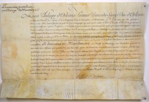 Louis Philippe, Duc d’ORLÉANS (1725-1785) Père de Philippe-Égalité et Grand-père de Louis-Philippe : Pièce Signée “Louis Philippe d’ORLÉANS, Premier Prince de Sang, Duc d’ORLÉANS, de Valois, de Chartres, de Nemours de Montpensier, Comte de Vermandois de Soissons...” (En-tête gravé) - Brevet sur parchemin (47 x 32). Nomination à l’Office de Procureur Postulant au Bailliage de MONTAIGU en faveur du sieur Claude BIDON - Donné au PALAIS ROYAL à PARIS le 15 Mars 1776.