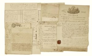 MEUSE. FOURNEL SEIGNEUR DE RONVAUX – Dossier de 12 Lettres et pièces, concernant les Seigneurs de RONVAUX : Jacques Pierre FOURNEL Ecuyer Seigneur de Ronvaux. Jean Pierre Joseph FOURNEL (Château Ronvaux [55] 1760 - ?) Lieutenant-colonel, Sous Aide Major des Gardes du Corps du Roi Compagnie NOAILLES DUC DE BERRY, Chevalier de ST-LOUIS retiré à VERDUN : Ensemble de formats divers, savoir : Lettre réclamant ses titres de Seigneur de RONVAUX (1774) ; Acte de vente (1782), Acte de décès de son frère Émigré en terre étrangère (Prairial An 10 avec vignette) Copies d’États de services (1815 1816), Document de 1816 signé du Maréchal Duc de FELTRE (CLARKE) et divers.