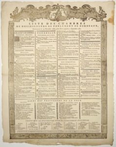 BORDEAUX (33). 1784. « Liste des Chambres de Nosseigneurs de Parlement de BORDEAUX, commençant le 14 novembre 1784, pour servir jusqu’au 7 Septembre 1785 » - Tableau décoré de bois gravés (Grand’Chambre, Chevaliers d’Honneur, Conseillers, Tournelle, Première Chambre des enquêtes, Chambre des Requêtes, Gens du Roi, Liste des Procureurs de la Cour, Fêtes que la souveraine Cour de Parlement solennise). Impr. à Bordeaux, chez Pierre Philippot, fossés de ville ; Son magasin est rue Saint James, vis-à-vis celle de Gourgue. Placard (53 x 42) État B