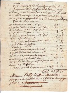CATHÉDRALE DE CHÂLON (Saône-et-Loire). “MÉMOIRE de la MUSIQUE que j’ay laissée à Mr l’Abbé BUFFARD Maître de Musique à la Cathédrale à CHÂLON (71) en Bourgogne le 4 Janvier 1787, qu’il m’a promis de chercher à m’en produire la vente et de me la renvoyer...”- Contrat de vente manus. 2pp in-4° - “Liste des prix convenus : 30 ouvertures en duo à 16 sols, 20 petits cahiers d’âmes à 22 S., 6 duo pour violon par Marie Vilé, 24 feuilles détachées pour piano forti et harpes à 5 S., etc..” –