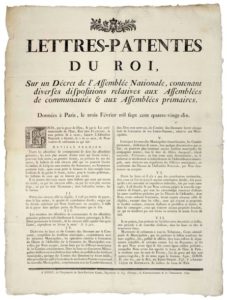 CÔTE D’OR. 1790. DIJON. ASSEMBLÉES PRIMAIRES : “Lettres-Patentes du Roi, sur un Décret de l’Assemblée Nationale, contenant diverses dispositions relatives aux Assemblées de communautés aux Assemblées primaires.” Signé (impr.) LOUIS XVI, DE SAINT PRIEST, visa de l’Archevêque de BORDEAUX - Données à PARIS le 3 Février 1790 - (dispositions : Serment Patriotique, Citoyen Actif ou éligible ; Milice bourgeoise, Garde Nationale Volontaire ) - Impr. à DIJON (21), Chez Jean-Baptiste CAPEL, Imprimeur de Mgr l’Evêque, du Commandement de l’Intendance, 1790 – Vignette Royale lettrine. Placard (51 x 38) État A