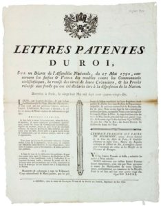 BRETAGNE. 1790. (ABOLITION DU CLERGÉ RÉGULIER.) ”Lettres patentes du Roi, sur un Décret de l’Assemblée Nationale, du 27 Mai 1790, concernant les SAISIES VENTES des meubles contre les Communautés ECCLÉSIASTIQUES, la remise des titres de leurs Créanciers, les Procès relatifs aux fonds qui ont été déclarés être à la disposition de la Nation.” signé LOUIS XVI, DE ST PRIEST. Données à PARIS le 28 Mai 1790 - Suivi de l’Ordonnance de Germain-François DU FAURE DE ROCHEFORT Commissaire départi pour l’exécution des Ordres de Sa Majesté en BRETAGNE - Vignette Royale. Impr. à RENNES (35), chez François Vatar de Bruté de Remur, Imprimeur du Roi, 1790. Placard (45 x 35) État B