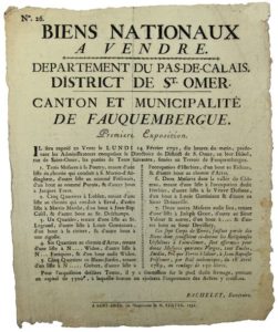 PAS-DE-CALAIS. 1791. BIENS NATIONAUX à vendre. N°26 - Canton et Municipalité de FAUQUEMBERGUE. - Il sera exposé en vente le 14 février 1791, pardevant les Administrateurs... de SAINT-OMER, les parties de Terre, situées au terroir de Fauquembergue.. Biens dont jouissaient ci-devant les Religieuses Ursulines à SAINT-OMER - à SAINT-OMER, de l’Impr. de H. FERTEL. 1791. Placard (39 x 31) État B
