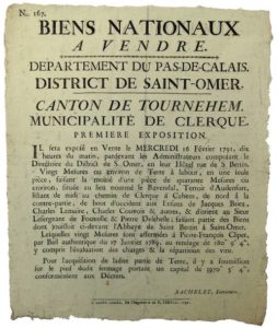 PAS-DE-CALAIS. 1791. BIENS NATIONAUX à vendre. N°167. Canton de TOURNEHEM. Municipalité de CLERQUE. Il sera exposé en vente le 16 février 1791, pardevant les Administrateurs, Vingt mesures de Terre à labour faisant partie des biens dont jouissait ci-devant l’Abbaye de Bertin à SAINT-OMER - à SAINT-OMER, de l’Impr. de H. FERTEL. 1791. Placard (38 x 31) État B