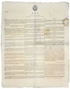 CORRÈZE. 1792. « Loi relative à la FORMATION DES LÉGIONS. » Donnée à Paris le 29 avril 1792 - Vignette « Droits de l’Homme. » - LOUIS XVI Roi des Français, l’Assemblée Nationale à décrété ce qui suit : « ... Considérant que le moyen le plus sûr de faire la guerre avec succès, est d’opposer à l’ennemi des troupes de même arme que celle qu’il emploie ; Que les troupes légères, connues sous la dénomination de LÉGIONS, rempliront cet objet, et qu’il est instant de les organiser… » - Loi en 28 articles. Lu au Département de la Corrèze. Impr. à TULLE, chez P. J. VACHOT, Imprimeur du Département. Placard (54 x 42) État B.