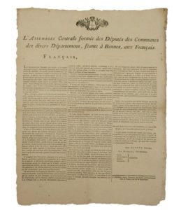 ILLE-ET-VILAINE. Septembre 1792. Adresse de « L’ASSEMBLÉE CENTRALE formée des Députés des Communes des divers Départements, séante à RENNES (35), aux Français. » « Formule de Serment prêté individuellement par chacun des membres de l’Assemblée centrale établie à RENNES. « Je Jure guerre éternelle aux tyrans, aux traîtres, aux anarchistes ; je jure de maintenir la Liberté, l’Égalité, la République une et indivisible, la sureté des personnes et de propriétés, je jure de n’employer les pouvoirs qui m’ont été confiés par le Peuple, que pour faire respecter la Souveraineté Nationale. » RUINET président - Impr. à RENNES, chez ROBIQUET, Imprimeur du Département d’Ille-et-Vilaine, rue de la République - Placard (52 x 39) État A