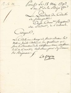 GUYTON MORVAU (Louis-Bernard, baron) Dijon 1737-1816 - Avocat, Chimiste, conventionnel de la Côte d’Or. Pièce signée « L.B. GUYTON » Le Président du Comité de Salut Public, aux Commissaires Régisseurs des Poudres, à l’Arsenal. Paris le 18 Mai 1793, An 2. 1p in-4° - « Citoyen, le Comité me charge de vous adresser la note contenant les questions qui sont le résultat de la Conférence tenue avec vous le 15 de ce mois ; et de vous prier d’y donner vos réponses. »