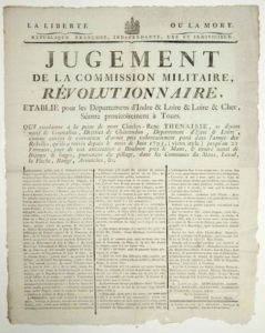 (CHOUANS.) Placard (53 x 42) « JUGEMENT DE LA COMMISSION MILITAIRE RÉVOLUTIONNAIRE, établie pour les Départements D’INDRE-ET-LOIRE, LOIR-ET-CHER, séante provisoirement à TOURS, qui condamne à la peine de mort Charles-René THENAISIE, se disant natif de COURTALINS (Courtalain), District de Châteaudun, Département d’Eure et Loir, comme atteint et convaincu d’avoir pris volontairement parti dans l’Armée des Rebelles, qu’il a suivi dans le mois de Juin 1793 (Vieux style) jusqu’au 22 Frimaire (1793), jour de son arrestation à BOULOIRE près le MANS, trouvé nanti de Bijoux linges, provenants du pillage, dans les Communes du MANS, LAVAL, LA FLÈCHE, BAUGÉ, AVRANCHES, etc. » - Impr. à TOURS, de l’Imprimerie de C. Billault, Imprimeur de la Société Populaire, rue des ci-devant Carmes.