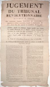 PAS-DE-CALAIS. AN 2. PEINE DE MORT. « Jugement du TRIBUNAL RÉVOLUTIONNAIRE établi à ARRAS qui condamne Guislain LALLART dit DELEBUQUIERE, Négociant à Arras, convaincu, d’être l’un des auteurs ou complices de la conspiration ourdie et continuée depuis quatre ans contre le peuple Français et sa liberté, ayant conservé et distribué des écrits les plus incendiaires, les plus royalistes et les plus fanatiques possibles, propres à corrompre l’esprit public et les Citoyens, à la peine de mort. Prononcé à Arras le 2 Floréal An 2 (1794) - Impr. à ARRAS, chez le Citoyen LEDUCQ – Placard (73 x 41) État B