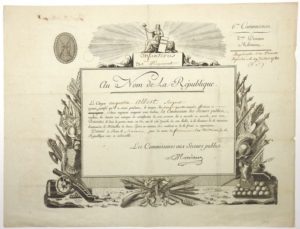 BREVET DES DEUX ÉPÉES. Décoration militaire : Duplicata du Brevet expédié le 29 Juillet 1780, au citoyen Augustin ALBERT Sergent, ayant justifié qu’il a servi pendant le temps de 24 années effectives et s’étant toujours comporté avec valeur. Le Commission de Secours publics lui accorde le droit de porter sur le coté gauche de son habit, à la hauteur de la troisième boutonnière, le Médaillon des Deux Épées en sautoir, donné à PARIS le 6 Frimaire an 3 (27 Oct. 1794) - 30° Régiment d’Infanterie - Grand Brevet gravée décoratif (42 x 32)