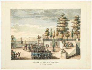 PARIS 1797. COUP D’ÉTAT DU 18 FRUCTIDOR An 5. Les troupes du Général AUGEREAU investissent les Tuileries. « Journée Célèbre du 18 Fructidor An 5 » par Girardet inv del. Bertault Sculp. - (29 x 38 cm) Etat A. Coloris anciens.